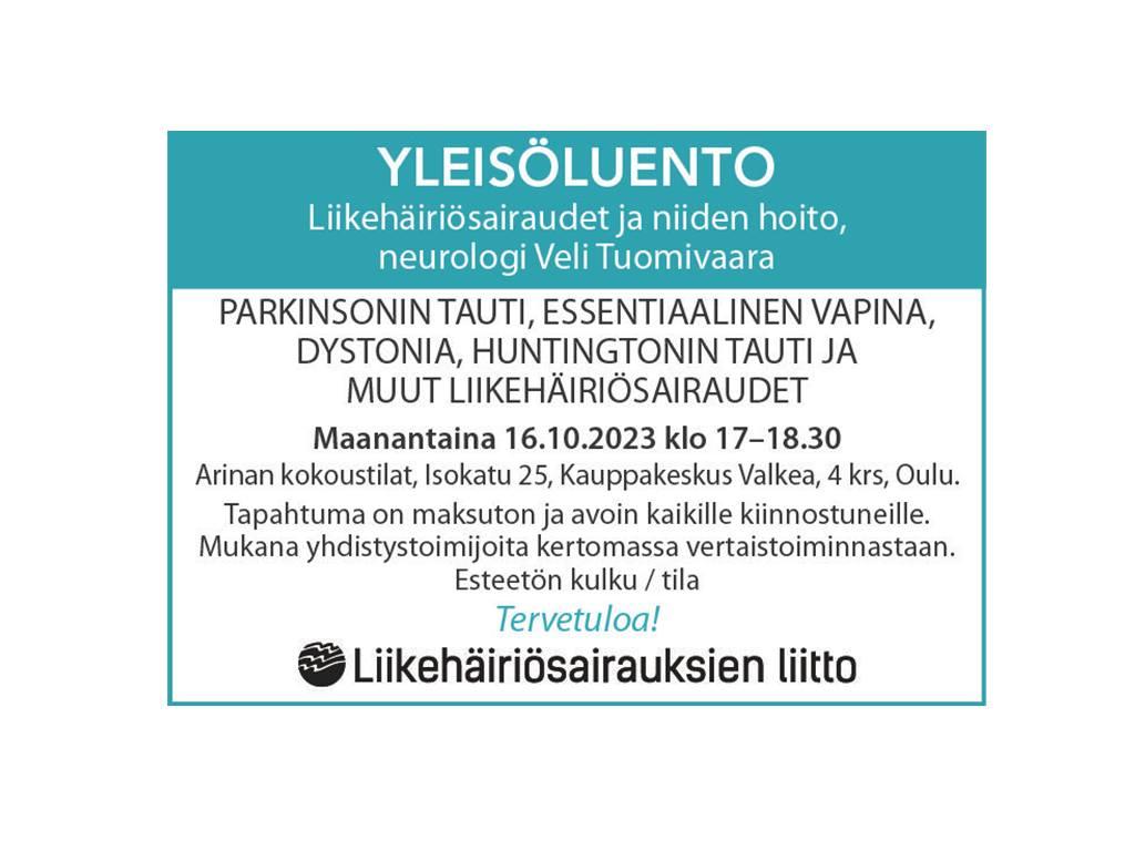 Yleisöluento 16.10. klo 17–18.30 aiheena liikehäiriösairaudet ja niiden hoito, luennoitsijana neurologi Veli Tuomivaara.